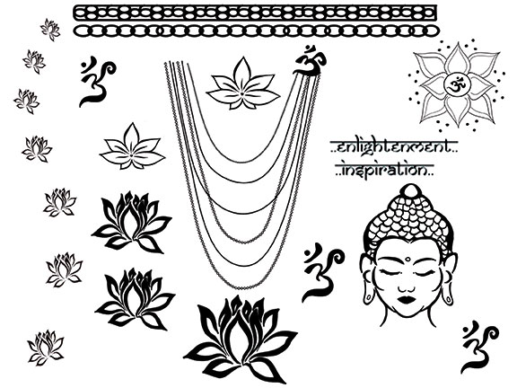 Beautiful Asian style motifs of Buddha, lotus flowers, oms, all hand drawn by our artists. Wear as jewelry, tattoos or with inspirational sayings! Please allow up to 4 weeks for delivery. Limited quantities available, by special order. Designed by RG and BB!