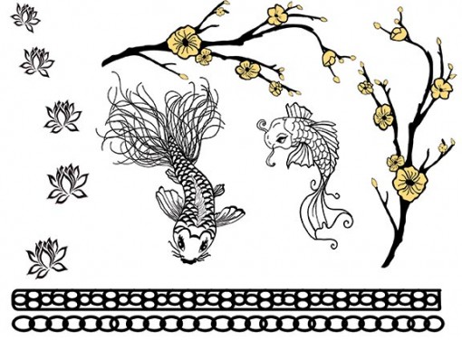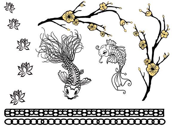 Koi, Lotus and Cherry Blossom Tattoo Sheet-Black